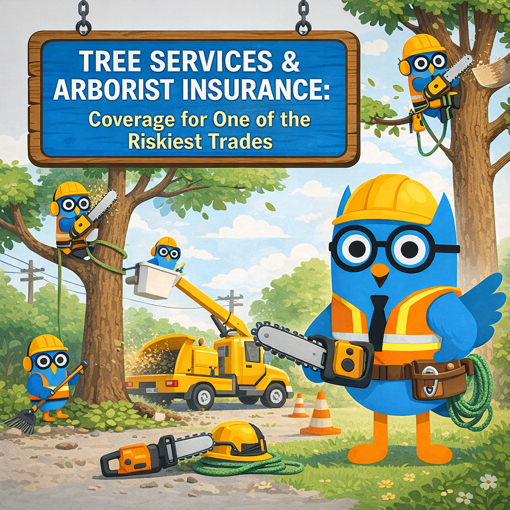 Hoo’s there? Mr. Hoots here, looking up instead of down for once. Tree work is one of the most dangerous contractor trades out there. You deal with chainsaws, heavy limbs, unpredictable falls, power lines, and tight job sites. One wrong cut can cause serious injury, major property damage, or both. That is why tree service and arborist insurance needs to be built right from the start.